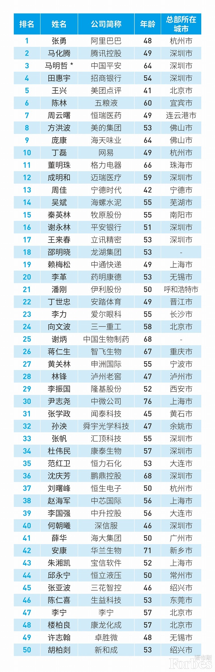 8月11日,福布斯发布中国最佳CEO榜,阿里巴巴张勇、腾讯控股马化腾、中国平安马明哲名列前三。值得注意的是,今年49岁的中通快递董事长赖梅松上榜,排名第19位,也是唯一一位上榜的快递公司老板。
