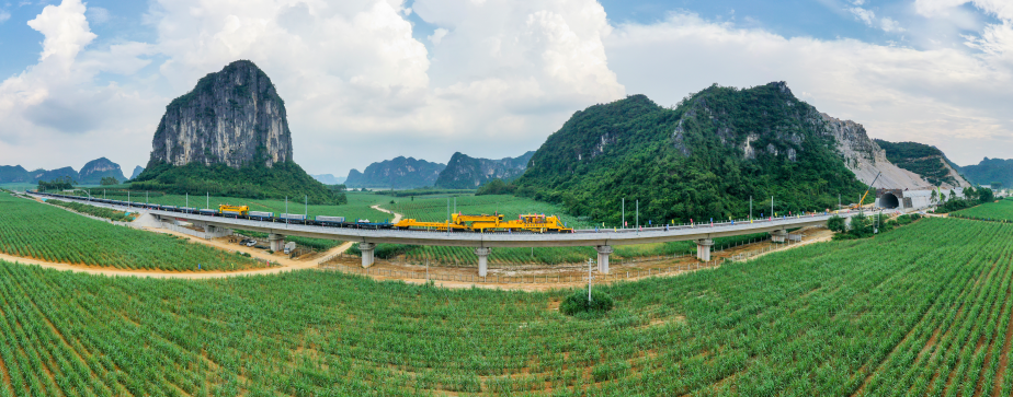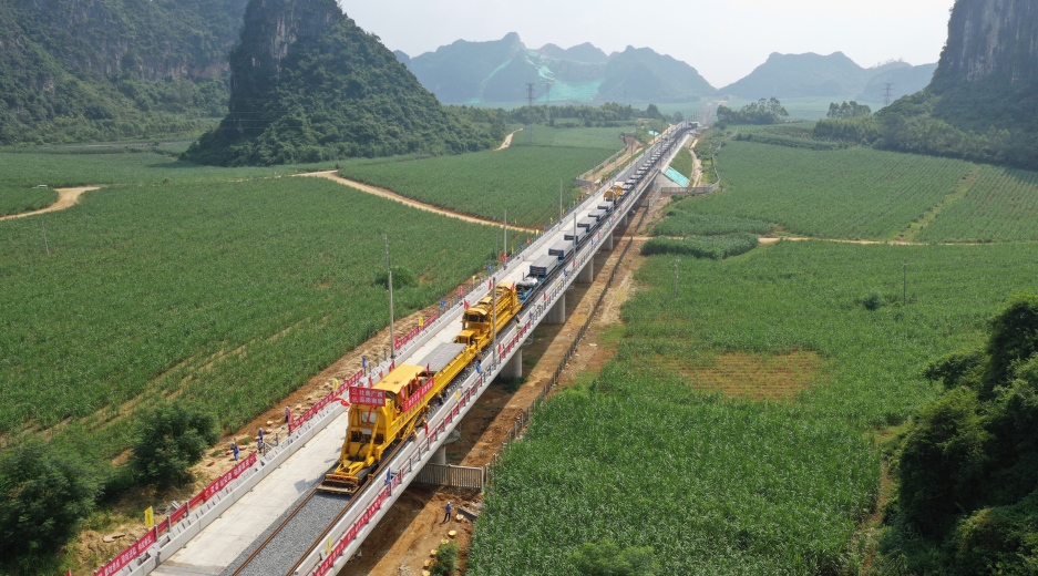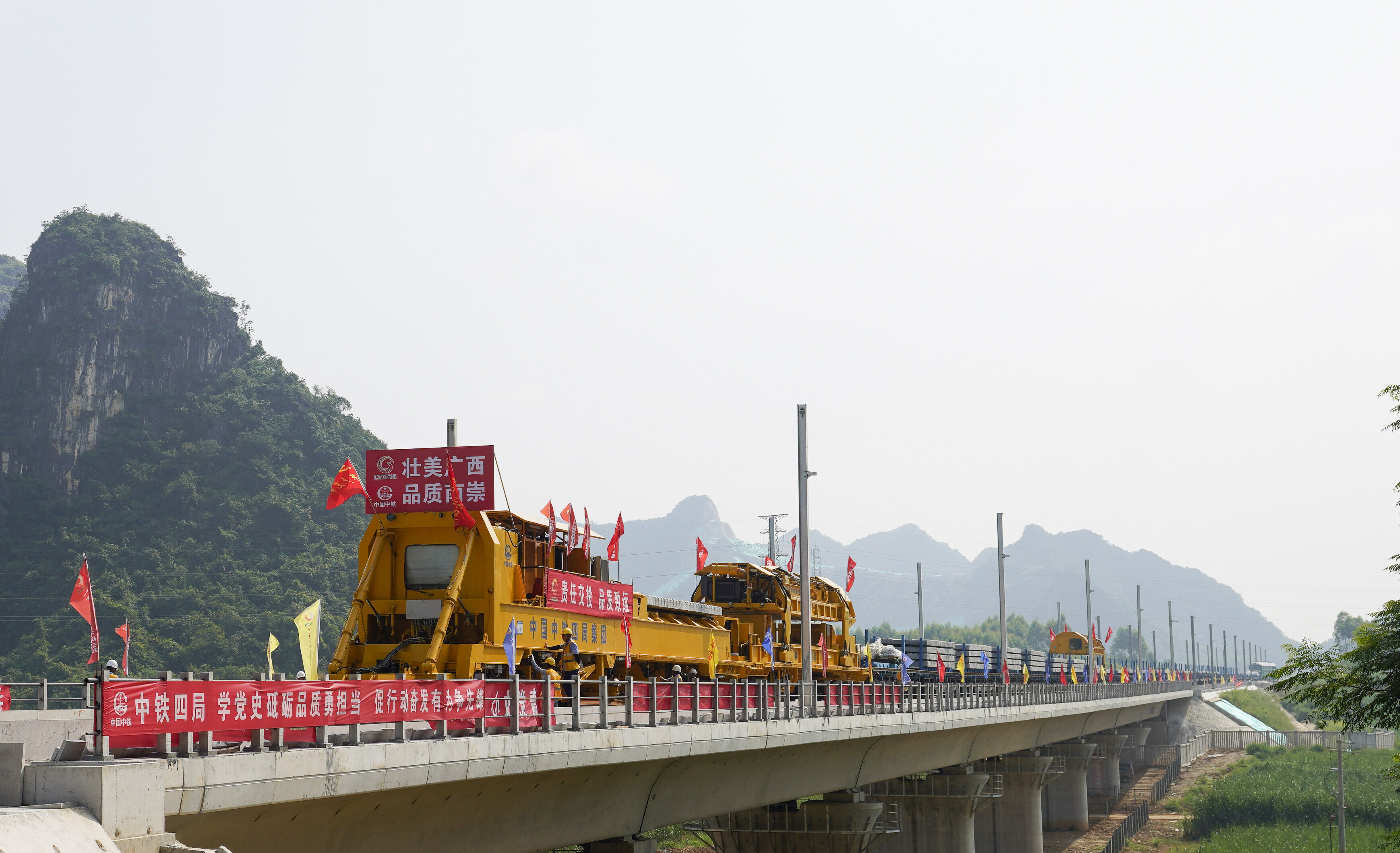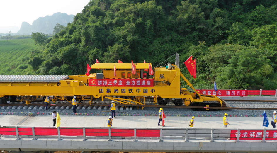 目前,南崇铁路项目已进入铺轨和工程建设冲刺阶段,铺轨(含站线)总里程约249公里。针对南崇铁路全线桥隧比高、沿线通信信号盲区路段多、长轨运输困难等实际,广西交投南崇铁路公司会同参建单位中铁二院、中铁四局组成“交投先锋+攻坚突破团队”,以“交投先锋+五融品质党建”引领攻坚突破,开展技术攻关,解决了多项建设施工难题。南崇铁路铺轨施工将采用具有自主知识产权的国产CPG500型铺轨机组进行施工,同时还将利用世界先进的移动闪光焊轨机组,将500米长钢轨轨焊接成跨区间无缝线路,使列车运行更加平稳。