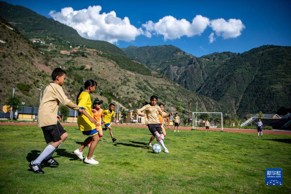 云南省怒江傈僳族自治州泸水市大兴地镇格力小学学生在球场上踢足球(2020年5月18日摄)。新华社记者 江文耀 摄