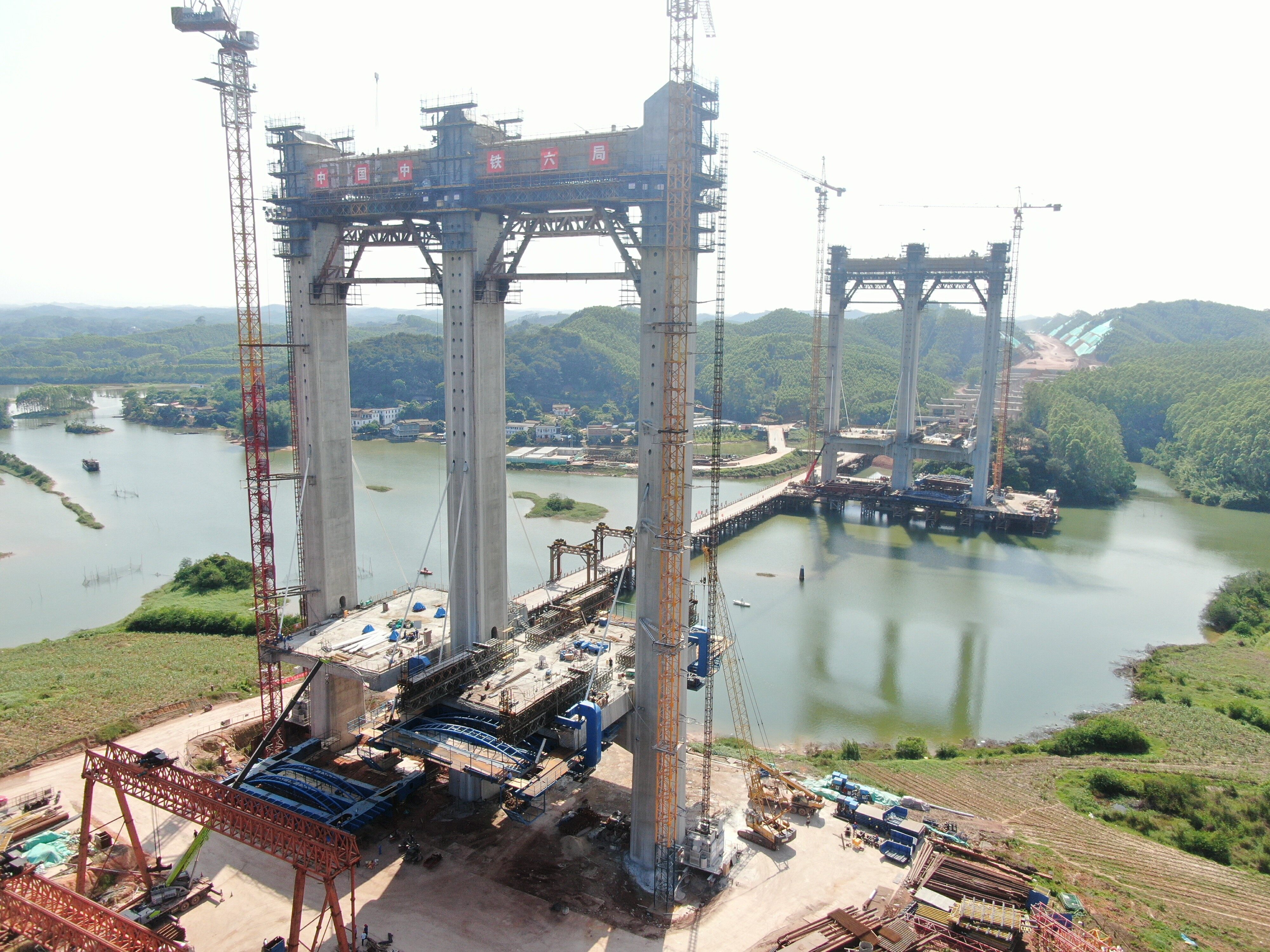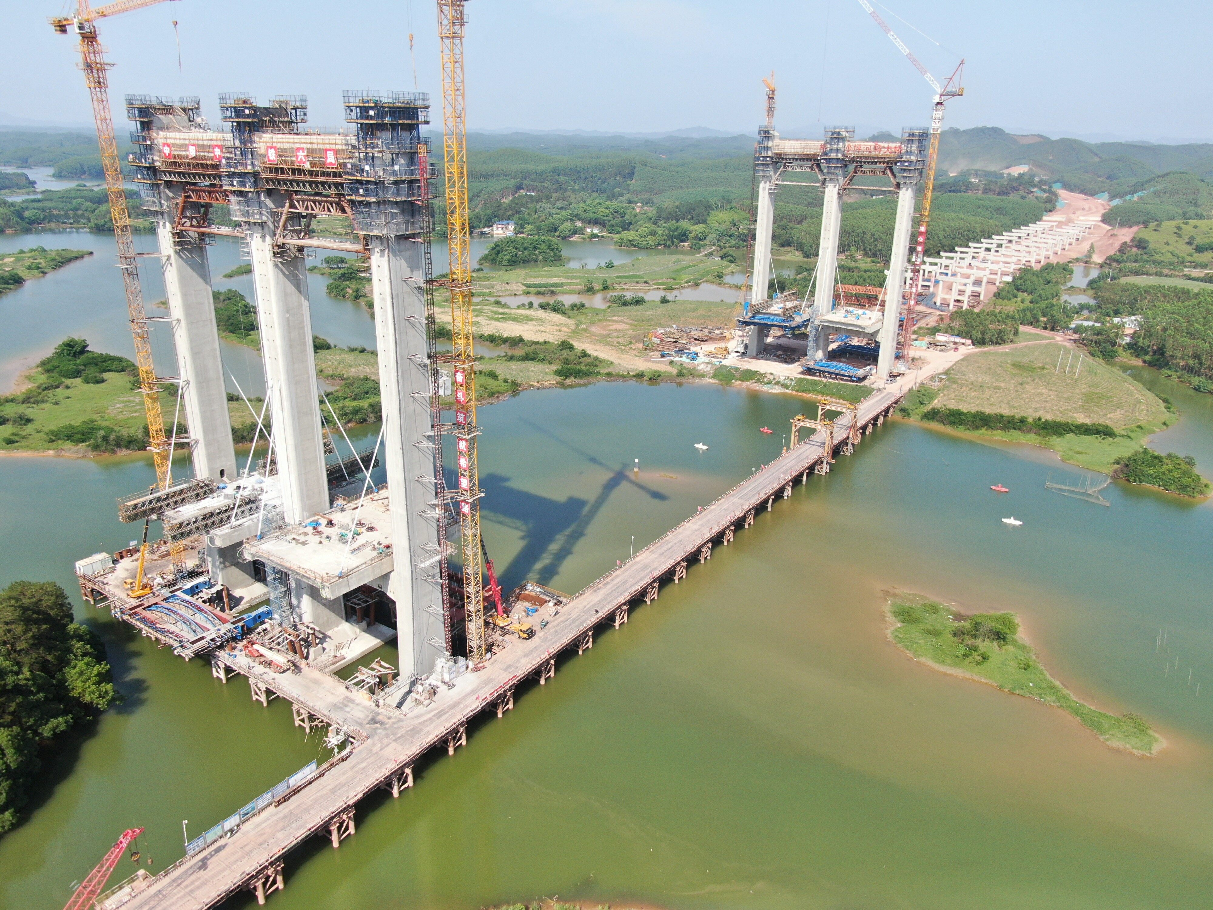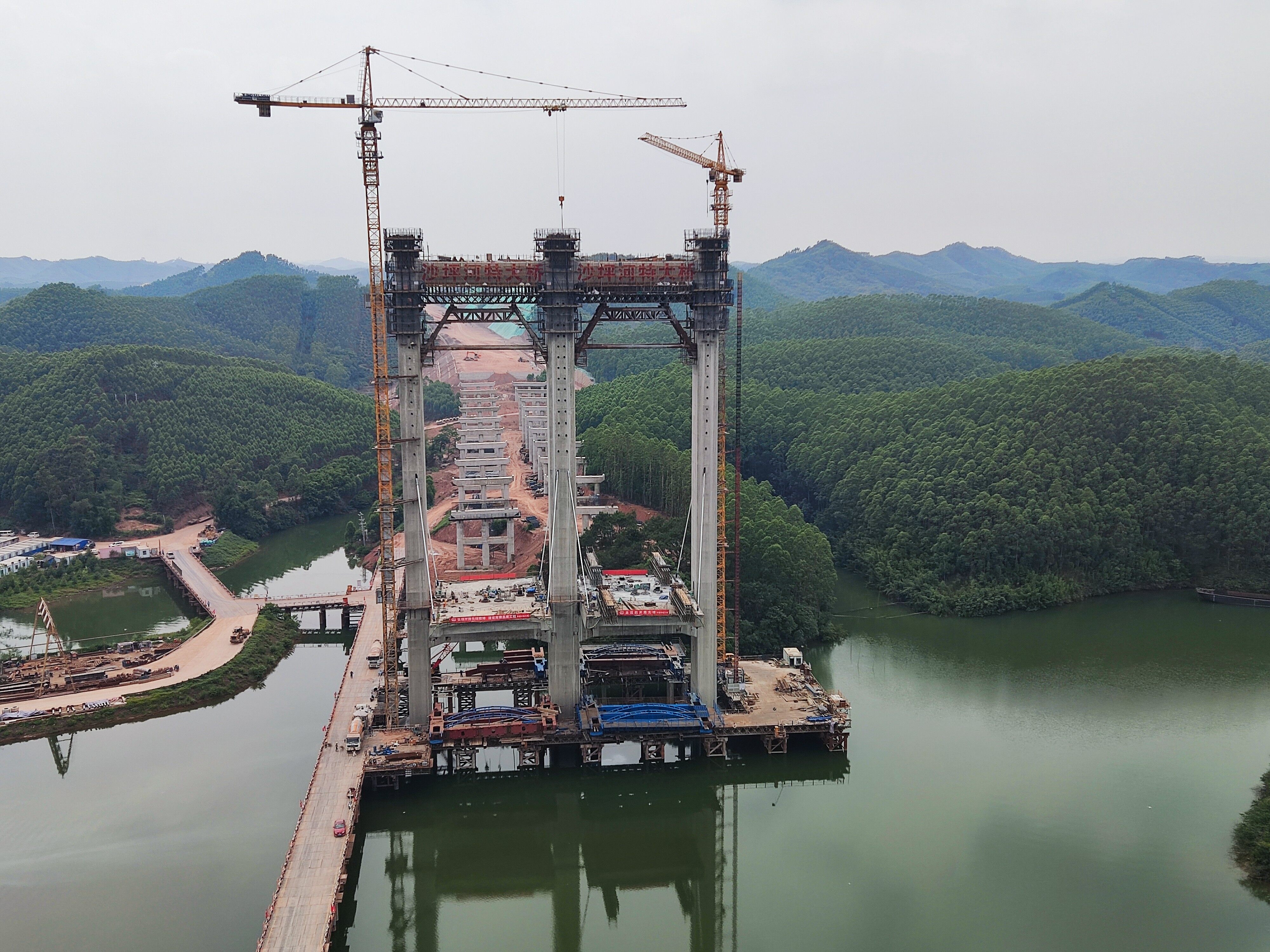 南横项目重点控制性工程沙坪河特大桥位于南宁横州市新福镇龙门新村。桥梁全长1507m,其主桥为双塔四索面应力混凝土斜拉桥,长度为498m,主跨跨径258m。本次封顶的主塔为沙坪河特大桥17号墩主塔,高度约99m,相当于33层楼高,桥梁建成后可满足未来平陆运河I级航道通航要求。
