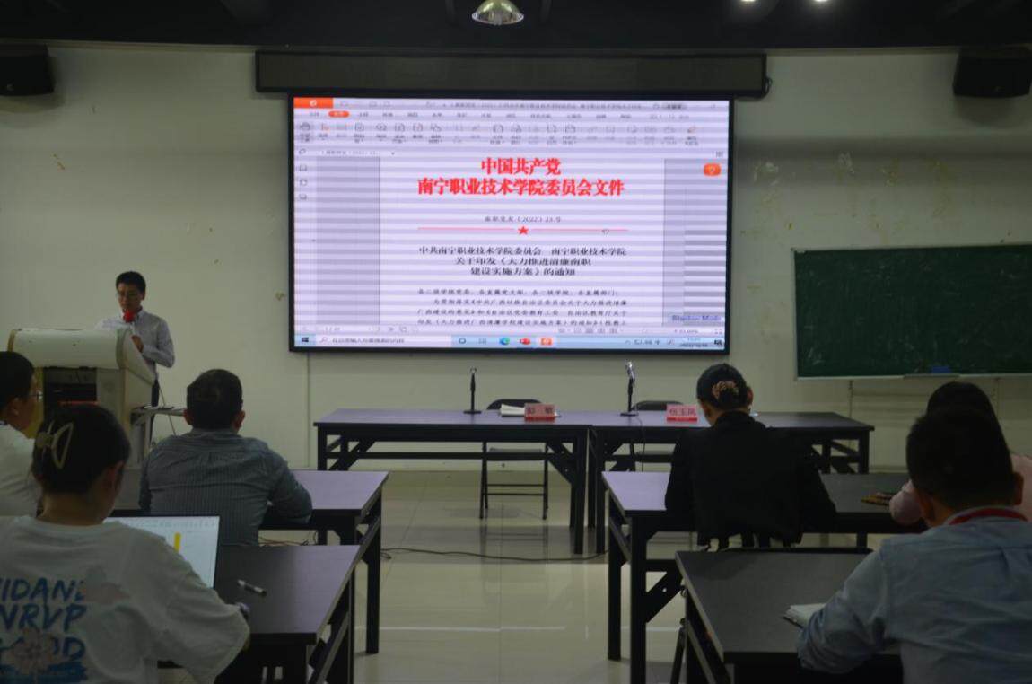 南宁日报客户端讯 为进一步推进清廉南职建设,实现校风学风一流、师德师风优良,近日,南宁职业技术学院商学院组织广大教师集中学习《大力推进清廉南职建设实施方案》等文件,对清廉南职建设工作进行再动员再部署。