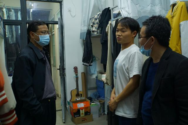 晚上6点30分,叶观荣来到学生宿舍,了解学生住宿情况。他认真查看了宿舍的基础设施建设,与同学们亲切交谈,询问学生学习、生活等方面的情况,并和同学们畅谈生活和理想,希望同学们努力学习,积极实践,不断促进自身德智体美劳全面发展。他强调,同学们要遵守学校的防疫政策,做好防疫措施,保持身心健康。