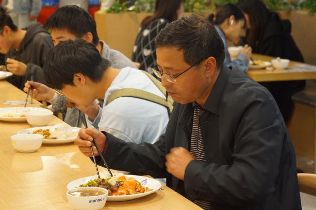 下午6点,叶观荣来到食堂,与同学们共进晚餐。就餐期间,叶观荣与学生们亲切交谈,并就食堂菜价,饭菜口感,卫生服务,设施设备等情况进行询问,对学生提出的意见与建议进行交流讨论,气氛轻松愉快,师生共同践行“光盘行动”。