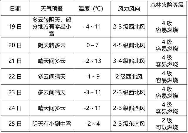 12月18日16时,商洛市气象台发布未来一周天气预报,受冷空气南下影响,预计19日夜间部分地方有零星小雪,25日全市有小到中雪;20-21日有4级左右西北风。其余时段以多云到晴天气为主。森林火险等级较高,需注意防范。