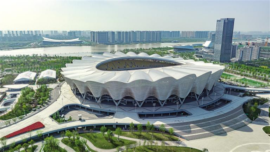 西安奥体中心体育场宛如一朵石榴花。 记者 肖阳熠摄