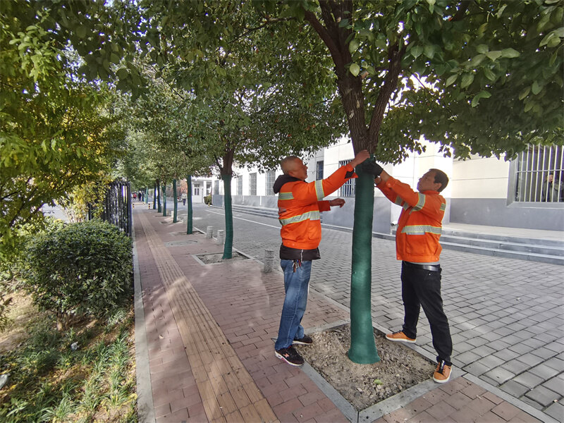 给树干“穿衣”保暖。为耐寒性较差的400余株香樟和新栽桂花的树干包裹防寒布,让其“穿衣”保暖,“着装”整齐划一。