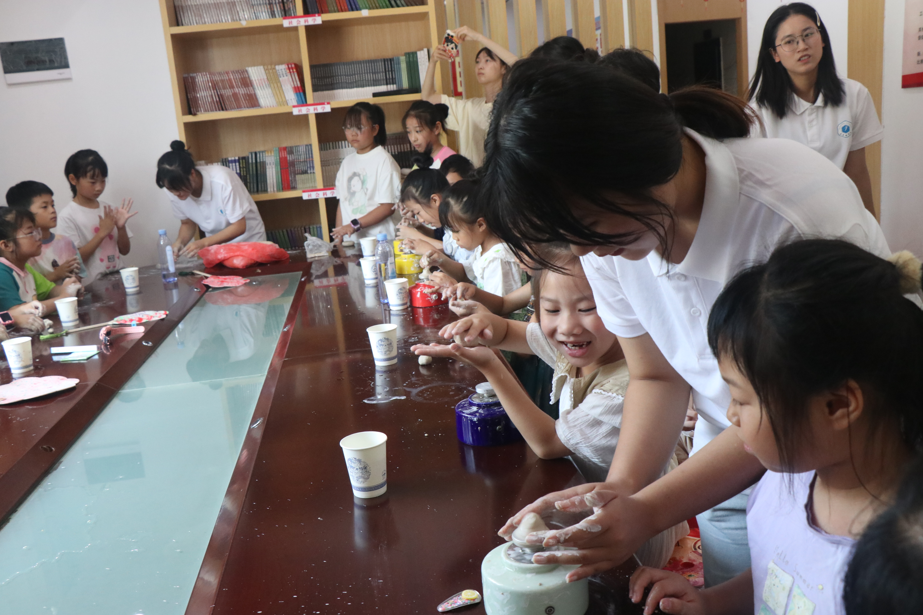 “请问,哪位小朋友知道漆扇吗?......”8月7日上午,浮梁县城东社区新时代文明实践站里,来自景德镇学院“瓷韵筑梦 七彩‘童’行”实践团的志愿者们,正在给社区小朋友讲授非遗手工漆扇制作和陶瓷制作技艺。