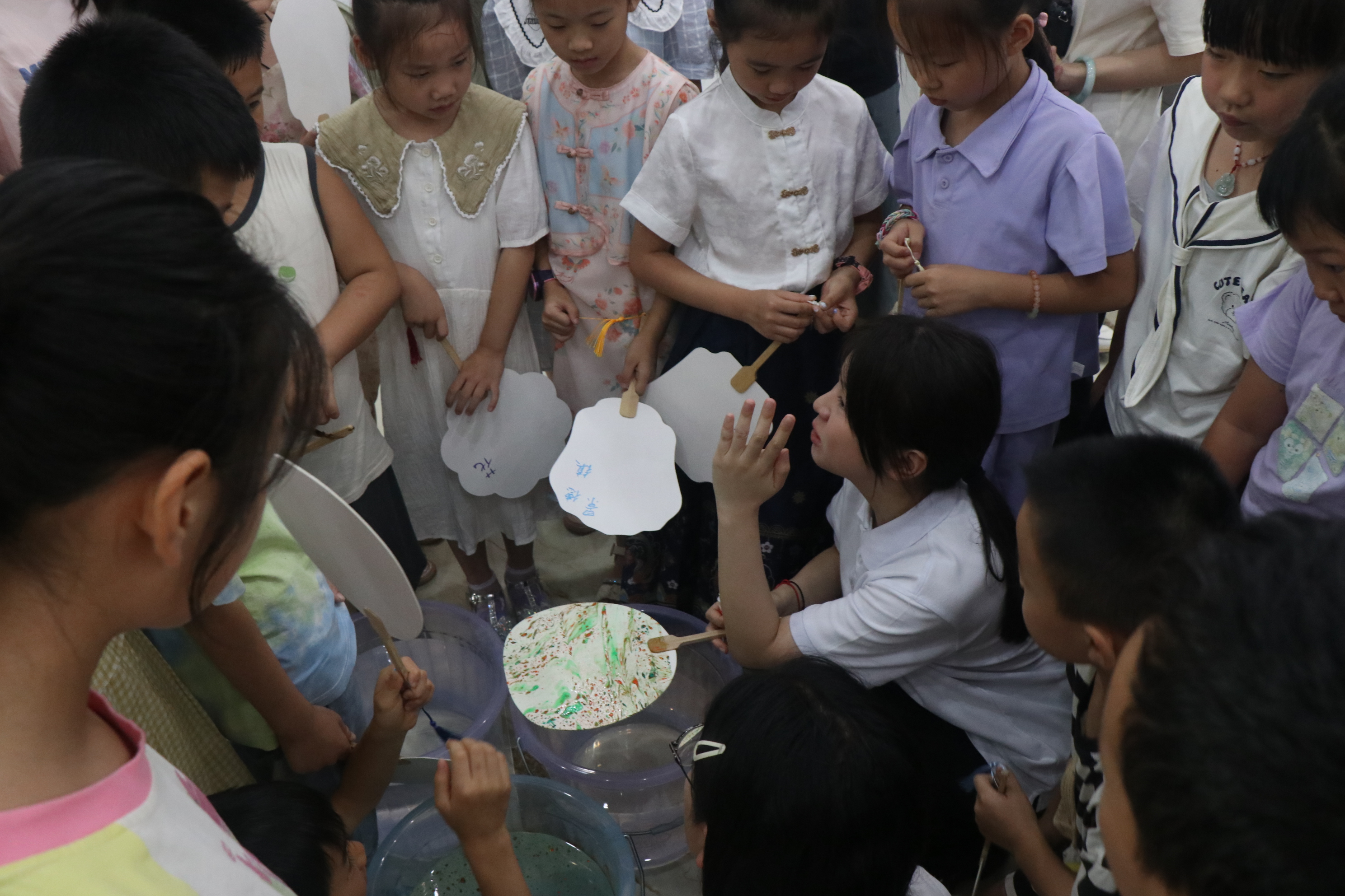 在上完理论课后,小朋友们在志愿者的指导下,以“漆”为画,以“扇”为纸,体验非遗手工漆扇的制作。一桶水,按自己喜爱调制的漆料,扇面在水中缓缓搅动,色彩跃然而上,独属于漆扇的美呈现在大家的眼前,给孩子们带来了惊喜。