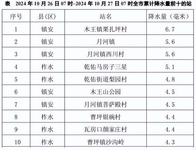 表 2024年10月26日07时~2024年10月27日07时全市累计降水量前十的站