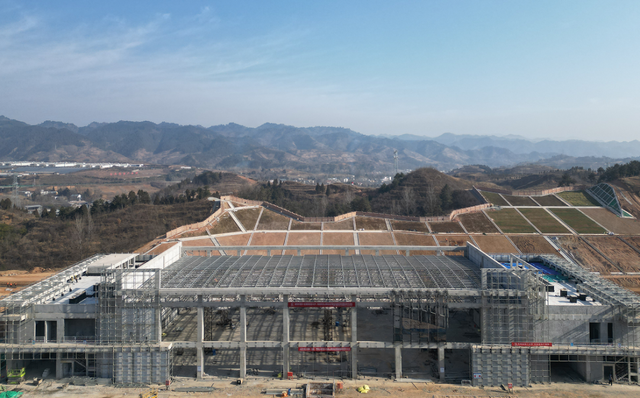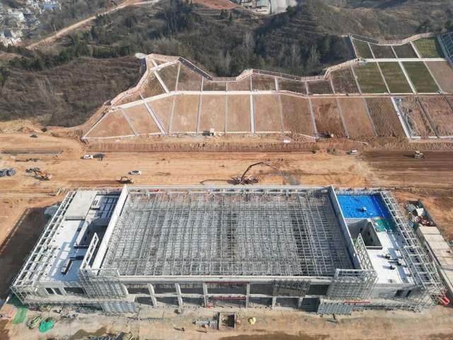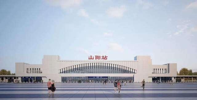 西十高铁山阳站站房以“峻岭崇山风光秀,平川美景画无边”为设计理念,主体采用钢筋混凝土结构,候车大厅顶部采用“钢网架屋盖+金属屋面”,为线侧式站房,建筑高度为16.65米,站场规模为2台4线,建筑面积为4999平方米。本次山阳站钢结构网架顶升,标志着山阳站正式进入装饰装阶段。