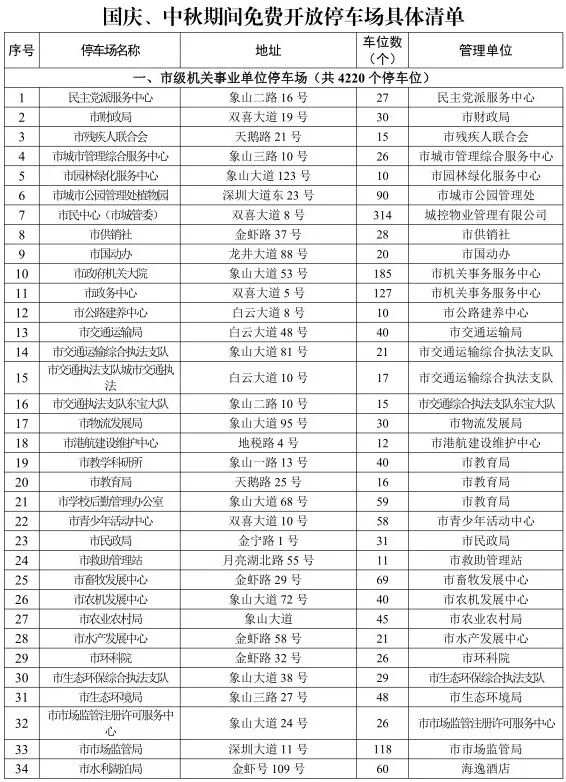 此次免费开放的停车场共160个、18026个停车位,包括中心城区具备开放条件的市、区两级机关事业单位(军事、涉密及特殊安保要求单位、学校、医院等除外)内部停车场和市、区有关国有企业运营管理的部分公共停车场,开放时间为2025年9月30日18:30至10月9日8:00。