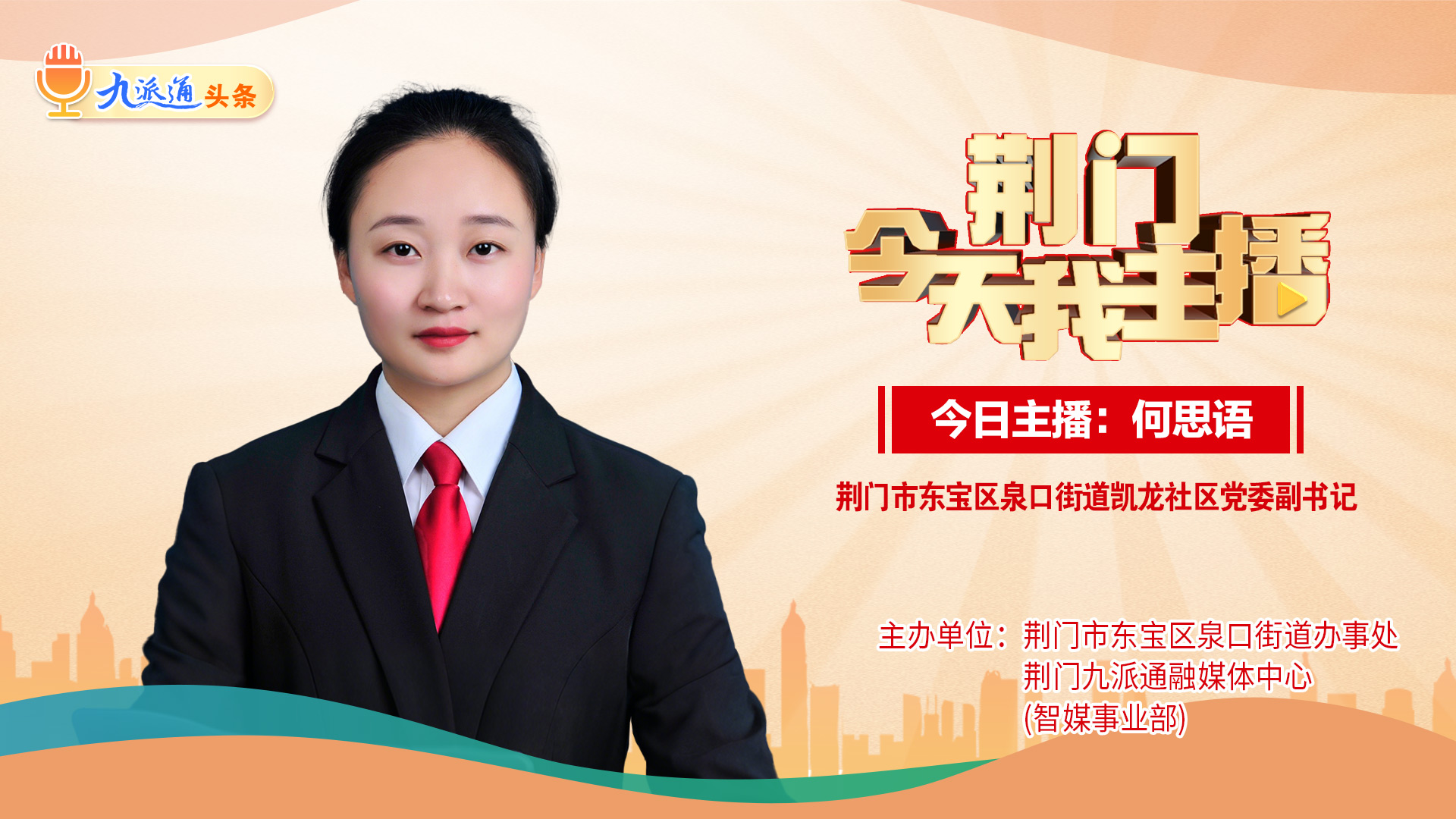 “荆门,今天我主播。”早上好!我是荆门市东宝区泉口街道凯龙社区党委副书记何思语。今天是9月30日,星期二,小雨,气温19~24℃。很高兴和你相约《九派通头条》。