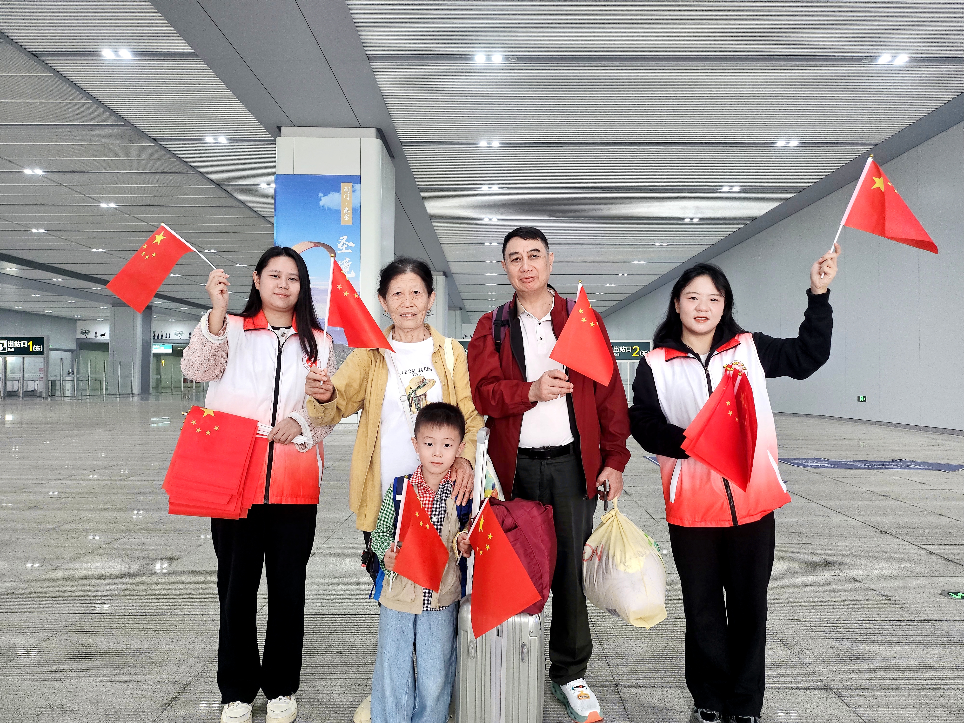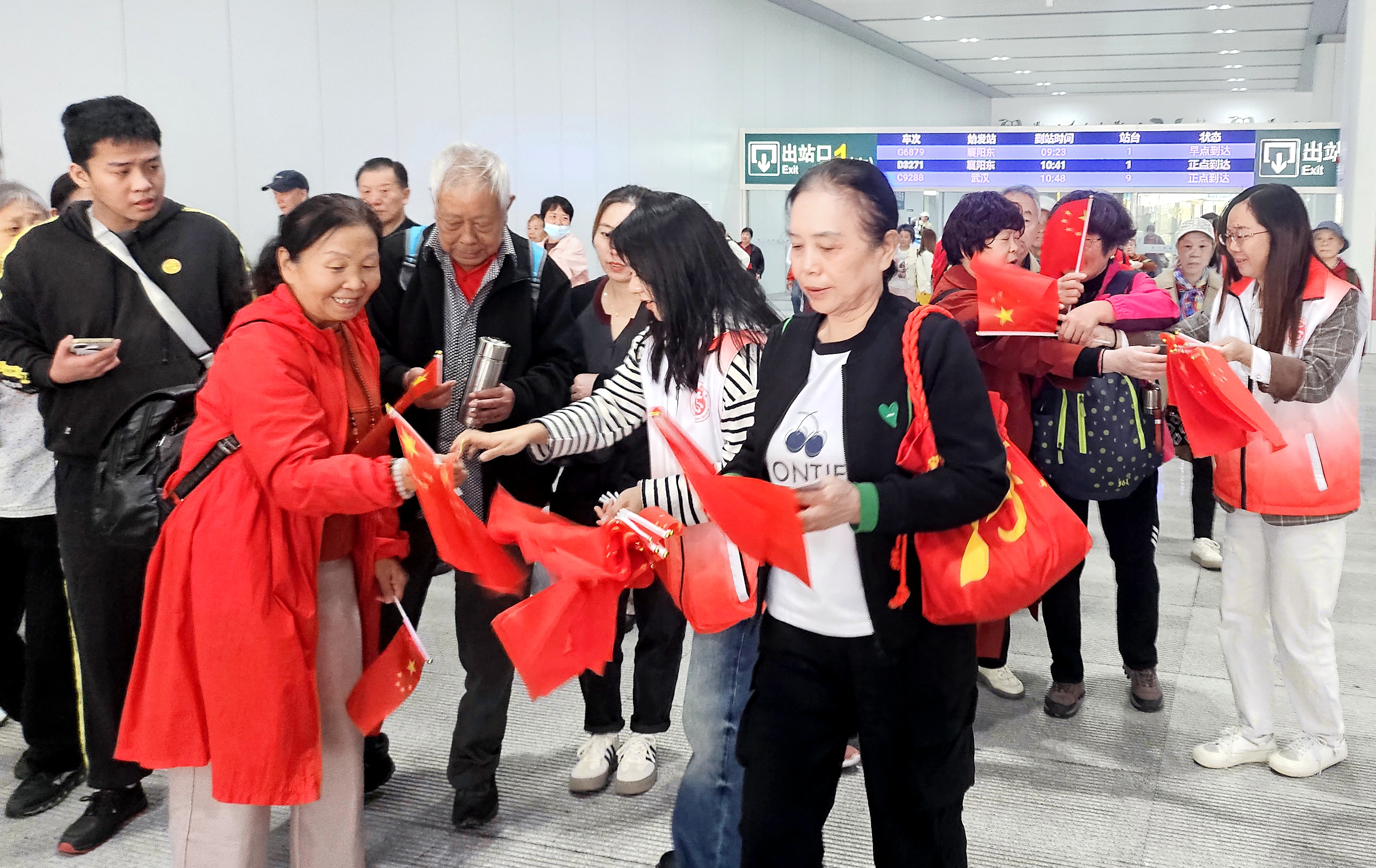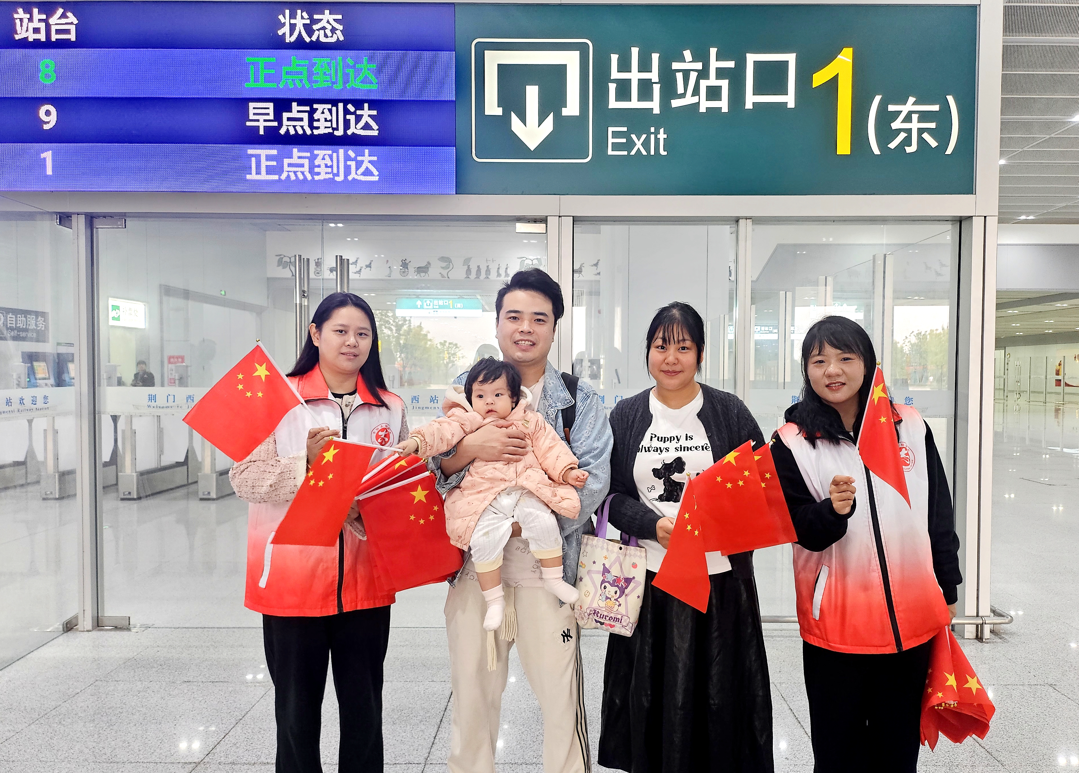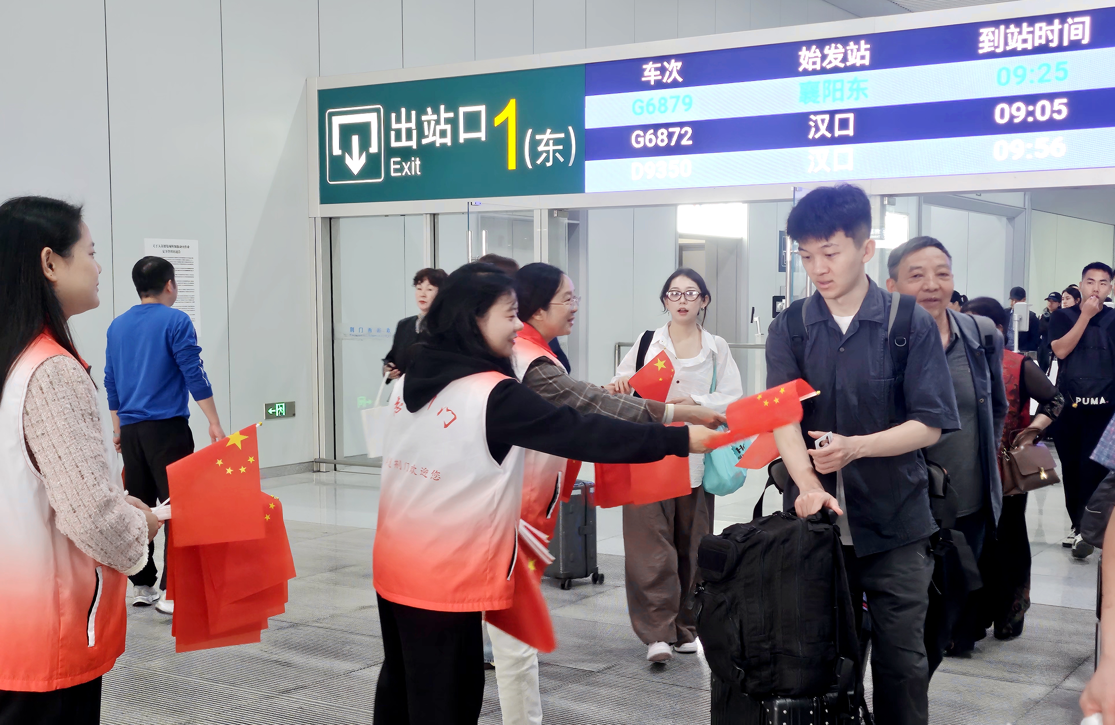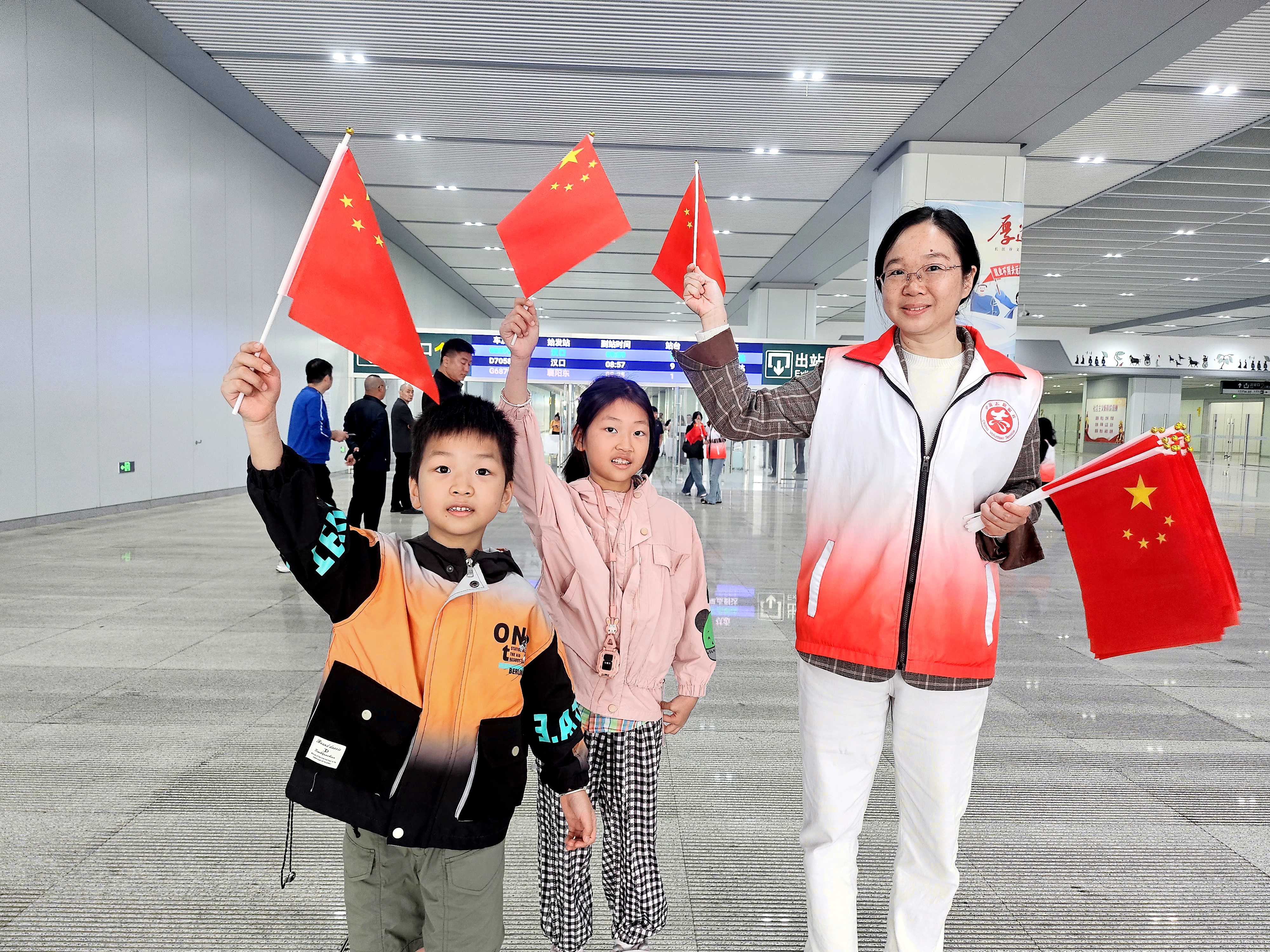 “一下车就收到这份惊喜礼物,感觉整座城市都在欢迎我们,国庆的氛围感瞬间拉满了!祝福祖国繁荣昌盛!”9月30日上午,从汉口来荆的张先生手举国旗,让志愿者帮忙拍张与国旗的合影,脸上写满感动与自豪。