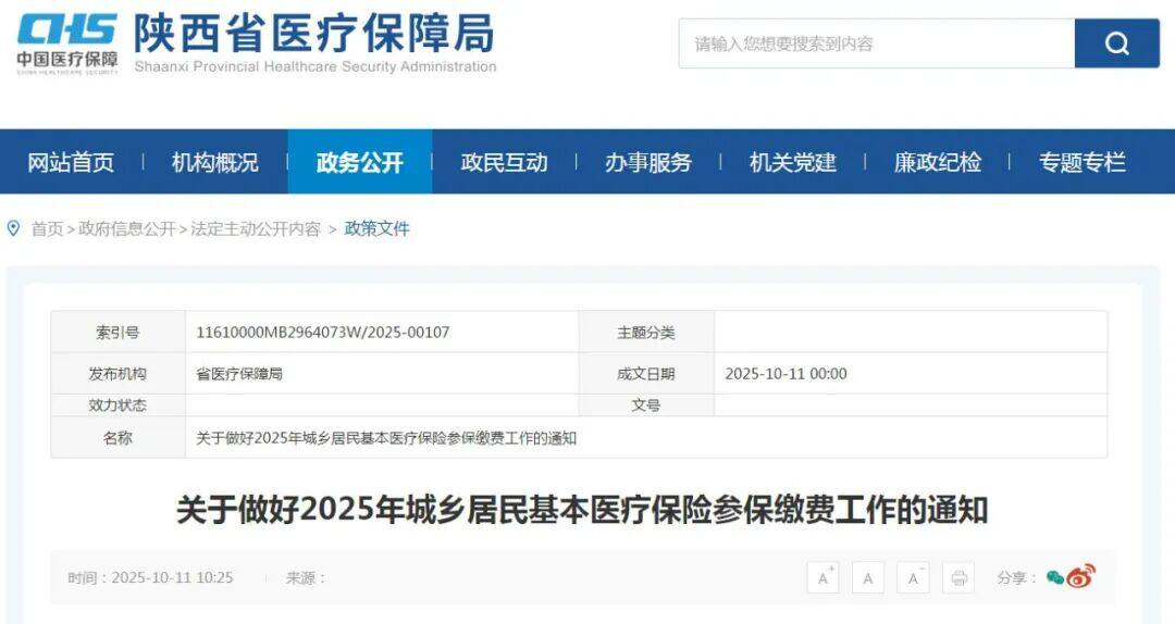 今天(10月11日)陕西省医保局发布《关于做好2025年城乡居民基本医疗保险参保缴费工作的通知》↓↓↓