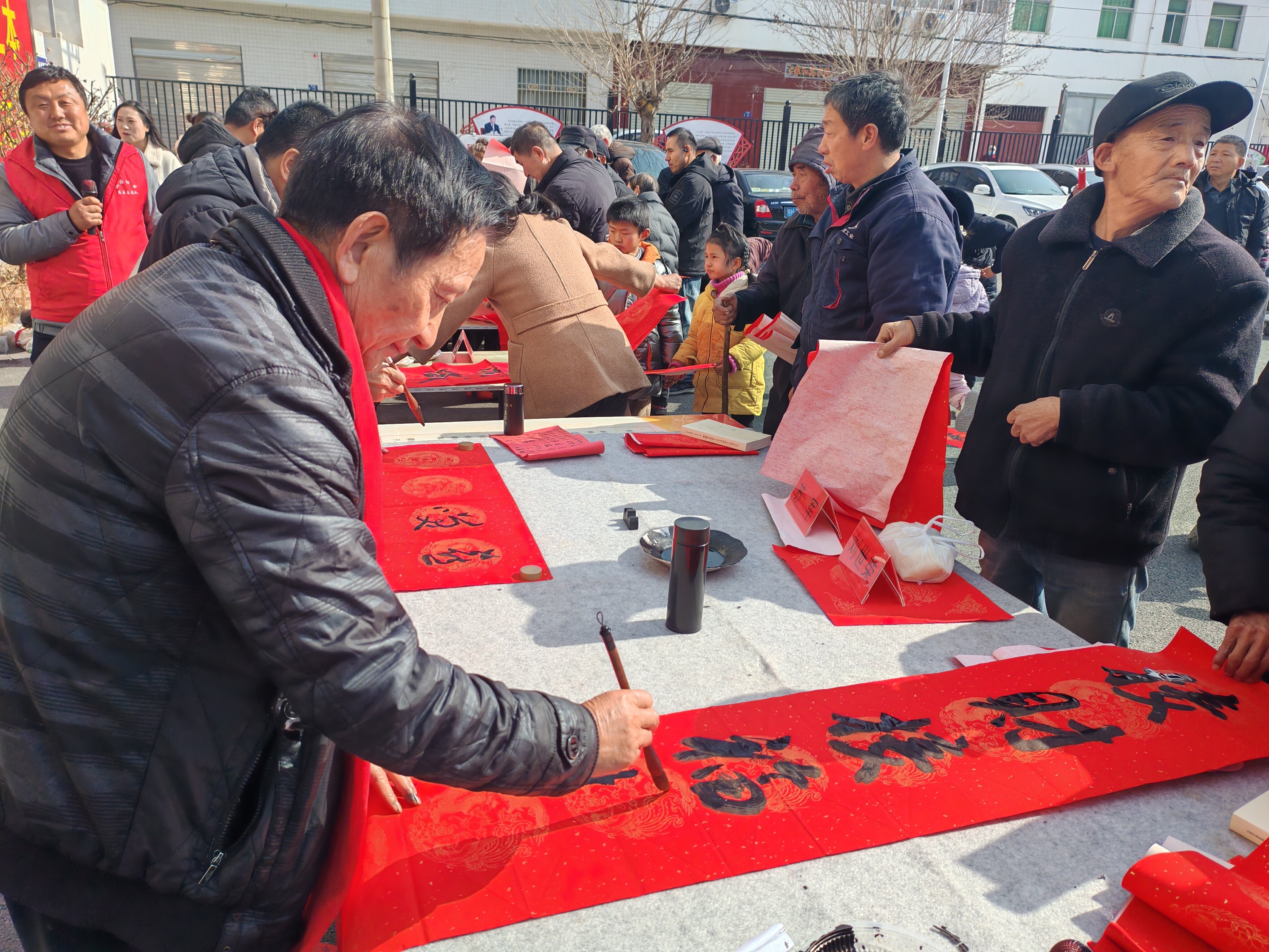 闻讯而来的社区居民络绎不绝,大家围在书桌旁,一边欣赏书法家们精湛的技艺,一边挑选心仪的春联,不时与书法家交流沟通,诉说着自己对新年的期盼,现场欢声笑语、其乐融融。志愿者们主动上前,帮忙铺纸、研墨、晾晒春联,将写好的春联小心翼翼地递到居民手中,一张张红火的春联、一个个喜庆的“福”字,承载着满满的暖意与祝福,送到了居民的心坎上。