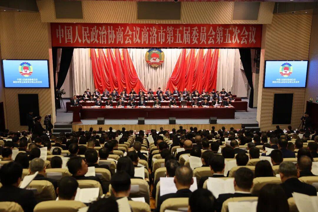 市行政中心多功能会议室内,气氛热烈庄重。主席台正上方悬挂的中国人民政治协商会议会徽在鲜艳的红旗映衬下格外醒目。主席台对面悬挂的“加快中国康养之都建设,全面推进‘三提三建’,奋力谱写商洛高质量发展现代化建设新篇章!”横幅鼓舞人心、催人奋进。