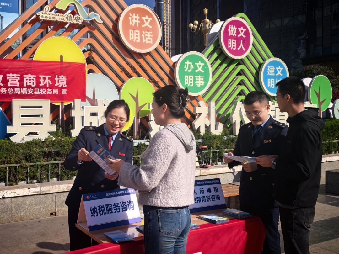 镇安县税务局在中心广场、政务服务中心设置宣传点位,多渠道投放个税汇算、小微企业优惠等政策资料,利用电子屏滚动展播普法内容;组建“税宣小分队”,深入企业一线答疑解惑。