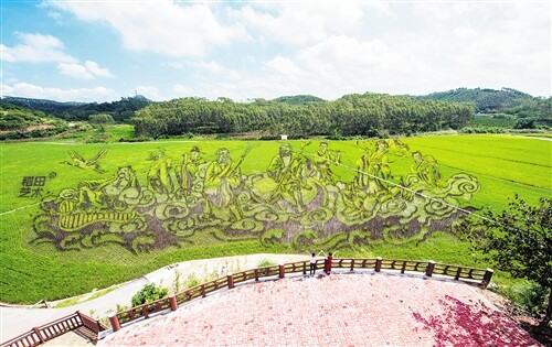 活动期间,除了大陆村的《八仙过海》,在古辣香米示范区高铁沿线位置还打造了总长度达3公里、画面占地面积500多亩的大型稻田艺术景观带。