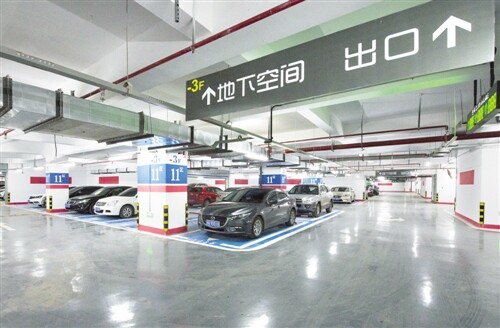 五象新区总部基地地下空间项目停车场宽敞明亮。