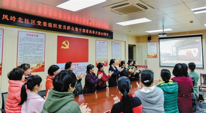 凤岭北社区的居民集中收看了庆祝大会直播。凤岭北社区党委书记丁红云说:“社区成立之初,凤岭片区是一片荒地。经过16年的发展,片区已变成环境优美、楼宇林立的城市核心区。社区办公服务场所也由成立之初的50平方米扩大到现在近3000平方米的党群服务中心,还配套建设了社区文化活动中心、卫生服务中心、居家养老日间照料服务中心、民族之家、‘时间银行’互助养老志愿服务站、好家风传承基地,以及图书室、书画室、心理辅导站等多个服务功能室。”