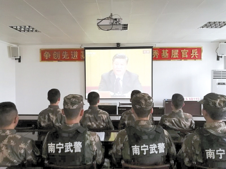 在武警广西总队南宁支队,官兵们集中收看了庆祝大会直播。在收看的过程中,现场不时响起热烈的掌声。“我的老家地处偏远,过去道路坑洼不平,村里的年轻人都不愿意回家。现在村村都通了水泥路,家家户户住上了新房,许多外出打工的年轻人也回乡创业发展。这都是党的好政策带来的大变化。”武警广西总队南宁支队执勤三大队执勤十中队战士马坤阳说,改革开放40年来,自己的家乡发生了翻天覆地的变化,今后一定要以实际行动牢记强军使命,坚定对党中央的信赖,以优异成绩争做党和人民的忠诚卫士。