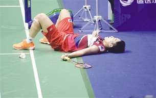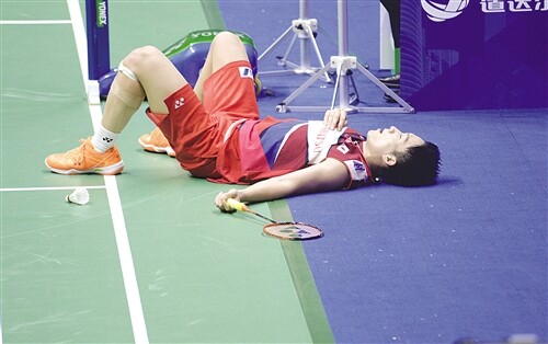 输球后的桃田贤斗失望地躺在赛场上 记者 宋延康 摄