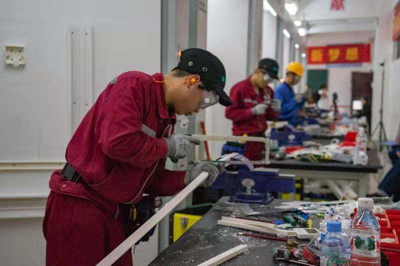 电气装置比赛现场,选手正在进行按照图纸,装配电气装置。韦京求 摄