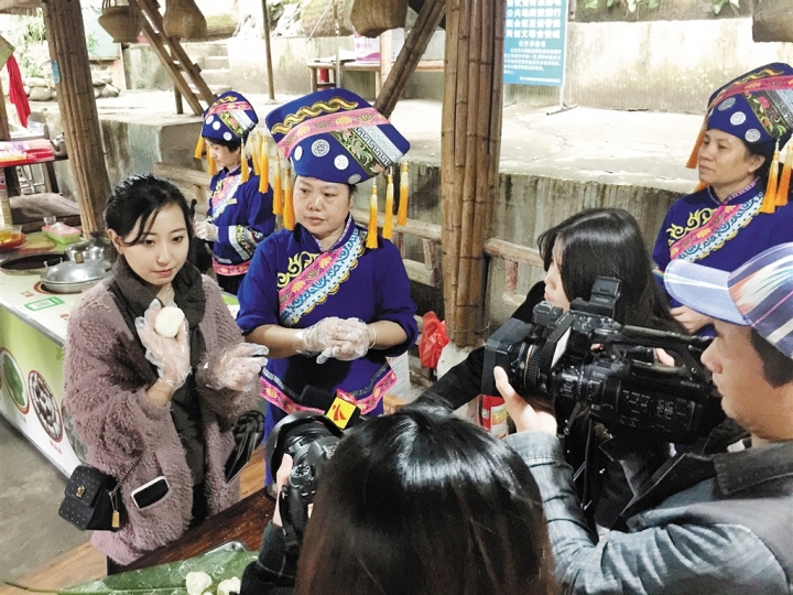 采风团在伊岭岩体验壮族美食制作。 杨志红 摄