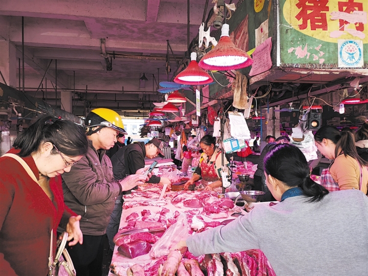 昨日中午,记者在西乡塘区白苍岭市场看到,各猪肉摊点的生意不错,一些出摊早的经营户已准备收摊。