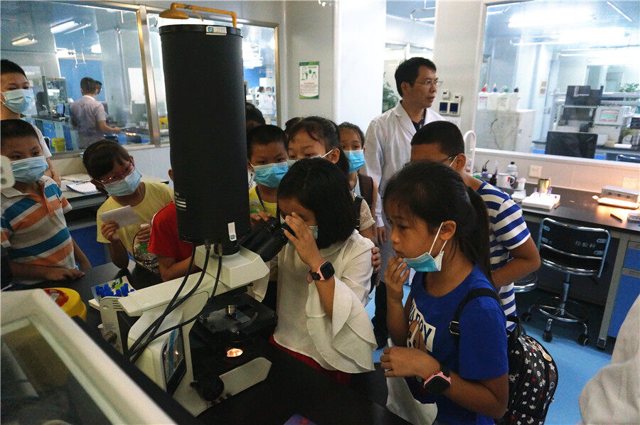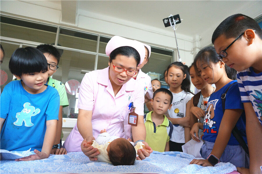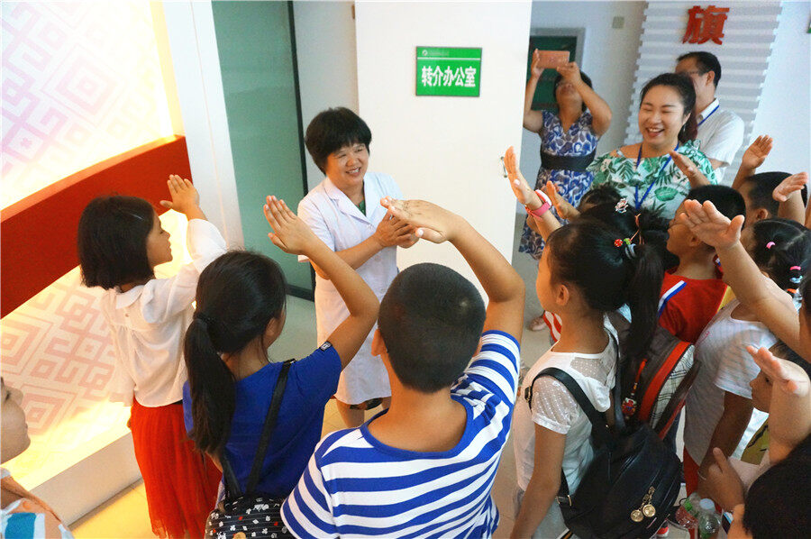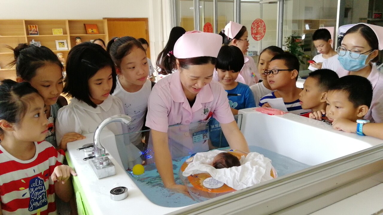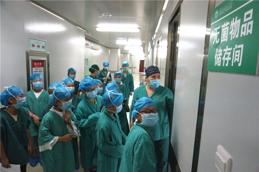 活动在第四人民医院“为生命站岗”石碑前启动,孩子们排成一队,有序地穿梭在医院的妇产科洗婴室、手术室、血透室、党建文化长廊、中医养生馆、检验科等医疗活动场所。所到之处,都有专业医护人员担任讲解员,并与孩子们交流互动。