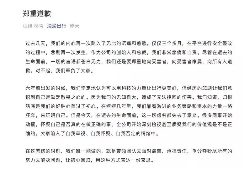 8月28日晚间,滴滴出行发布一份落款为程维、柳青的《郑重道歉》声明。声明称,“作为公司的创始人和总裁,我们非常悲痛和自责。尽管在逝去的生命面前,一切的言语都苍白无力,我们还是要郑重地向受害者,向受害者家属,向所有人道歉。”