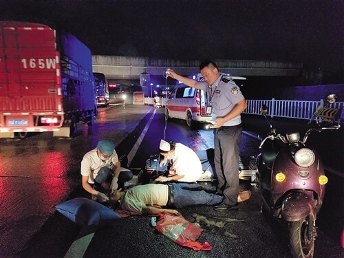 “男子的呼吸正常,就是无法叫醒。”陈威说,考虑到男子身上有伤,不便搬动,他们便找来安全锥在来车一侧摆放,并打开手机电筒引导车辆小心慢行,同时拨打报警电话。