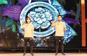 模特在新闻发布会上展示“南马”奖牌。 韦峭 摄