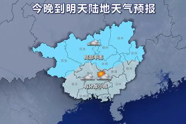 今晚到明天,百色、桂林、柳州、河池、来宾、贺州等市的部分地区有小雨,局部中雨,我区其它地区阴天到多云有分散小雨。