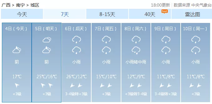 南宁市:今晚到明天,阴天间多云,有分散阵雨,东南风1~2级,最低气温17℃,最高气25℃。
