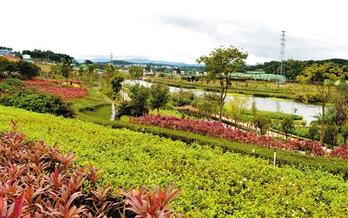 那考河湿地公园河道两岸栽满桂花树和朱槿,绿油油的草坪沿着河岸展开。走上亲水步道,一片片色彩斑斓的美人蕉花海映入眼帘,景色宜人。
