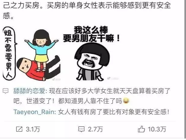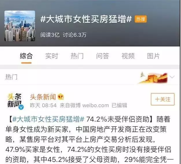 最近几天,一条#大城市女性买房猛增#的话题登上了微博热搜,媒体报道称,某售房平台上47.9%的买家是女性,她们当中甚至不少人完全凭一己之力买房,不需要伴侣或家里人的支持。