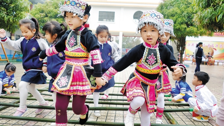 广西—东盟经开区第一幼儿园举行了以“壮族三月三,桂风壮韵浓”为主题的庆祝活动。教师们敲起铜鼓,孩子们随着鼓声跳起竹竿舞、铜鼓舞等,现场气氛热烈。