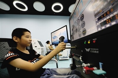 小游客在西安“九号宇宙”航天科普研学基地体验飞行器模拟驾驶。记者 李一博 摄