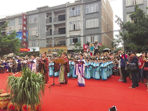 身穿传统汉服的村民朗诵 “赞牛歌” 记者 韦东 摄