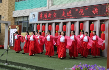 在节目中间,只见她们个个身着红色的汉服曲裾,折纤腰以微步,呈皓腕于轻纱,随着她们轻盈优美的舞姿,宽阔的广袖开合遮掩。一曲舞蹈《清平调》让人感受到汉唐雄风的流风余韵,充分展示了老师们的多才多艺、和蔼可亲。