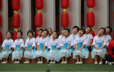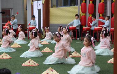 上午9时,活动正式开始,只见着红色古装的老夫子走上前台,依次请"穿越时空"而来的各个时代的幼儿们,报上他们今天要诵读的经典篇目。