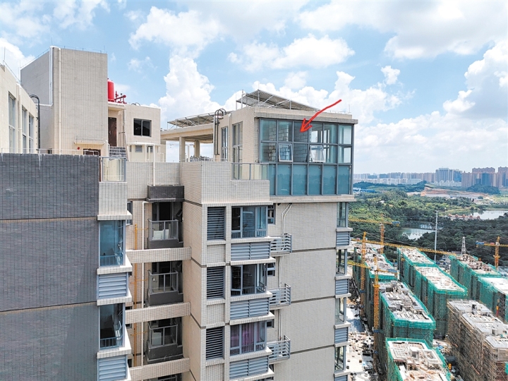昨日上午,记者来到该小区三期,在楼下往楼顶看,可以看到在楼顶边缘的天台面建有玻璃房子。一业主告诉记者,小区三期于6月30日交房,有多栋楼都是高层,最高的有34层。一些顶层业主擅自在楼顶违规搭建,有的还将单元楼顶大门锁上不让其他业主上去,以独占楼顶公共区域。