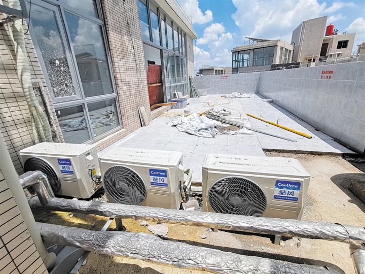 ▲楼顶地板正在铺设瓷砖,违建的房子外还安装有多台空调室外机,将公共天台变成“私家小院”