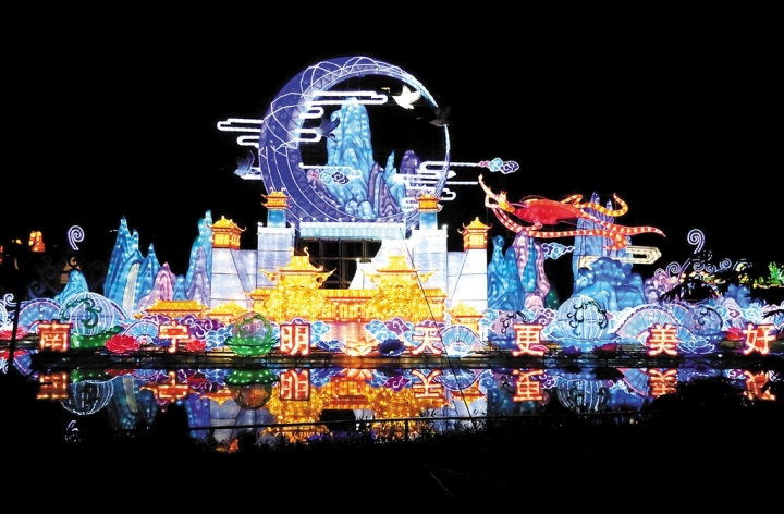 以青葱树木为主体的“绿水青山”灯组,用借景的手法展示南宁城市建设及生态建设成果。灯展上方和左侧集中展示了青秀山、广西民族博物馆、滨湖广场、南宁国际会展中心等城市标志景观,右侧和下方用城市景观和园林景观作为铺垫,展示南宁城市发展及生态建设的累累硕果。