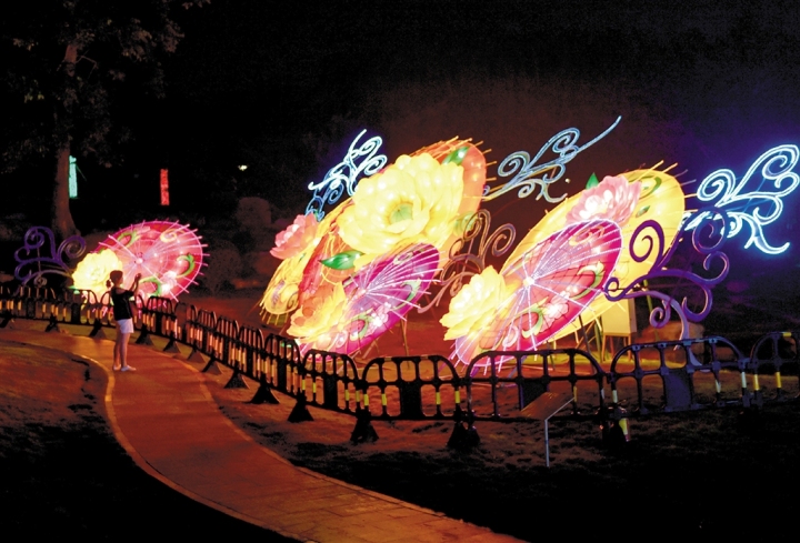 在景区东区的大门外,一座超大型的彩灯——“春之韵”首先展现在游客眼前,彩灯造型将花与扇面相结合,精致美观,独特新颖,点点星光,仿佛在向人们述说青秀山美丽动人的故事。