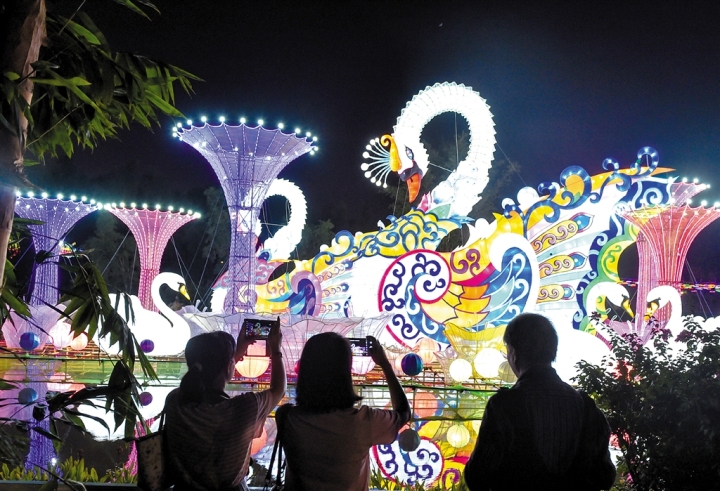“多彩南宁”灯组以中国传统的“景泰蓝”为主色调,人物主体采用浮雕制作,融入邕城众多人文元素,呈现出绽放花朵的视觉形象。整个灯组色彩极富感染力,为中秋佳节增添了浓厚的节日氛围。