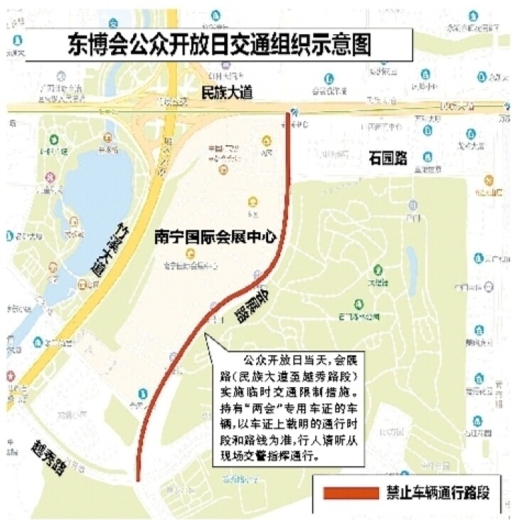 根据此前发布的临时限制交通措施的通告,今年东博会举办期间,南宁交警部门对民族大道会展路口、越秀路、竹溪大道等周边道路实行临时交通限制。禁止任何车辆在会展路停放,也禁止持证以外车辆进入会展中心。