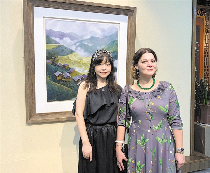 走进绿意环绕,古朴典雅的青秀山书院,精致简约的展厅衬托着一幅幅色彩饱满而浓烈的油画,给人以强烈的视觉感受。站在一幅名为《云中的生活》油画前,广西籍参展画家程玲正与画作作者叶卡捷琳娜·多罗霍娃交流绘画心得。这幅油画的创作地点位于广西龙胜梯田,云雾缭绕的远山,层层叠叠的梯田,还有背着背篓的瑶族少女,画中景致让人心驰神往。