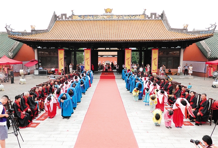 “子曰:夫孝,德之本也。人之行,莫大于孝。”上午10时,在司仪的引领下,参礼家庭跟随手举寿桃、寿杖的礼生,依次走过棂星门、状元门,踏上状元桥,穿过大成门走入大成殿前广场,并向先师孔子及先贤长者行礼,以立志践行孝道。